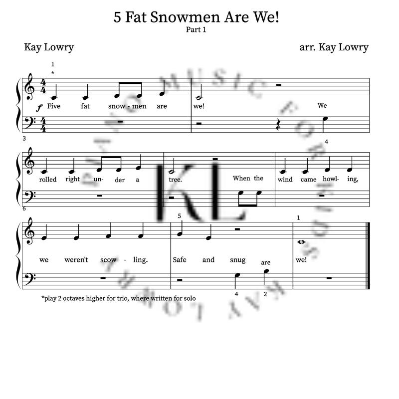 Here's how to find what you are looking for - in record time! Music Made with Kids in Mind! Select a Category Below, and Browse. Or- use the search bar! Store Categories: All Camps and Group Lessons Games & Group Activities Classical Physical Products under $3 Bundles and Deals Colors Method Books Ensembles Fall Songs Beginners Spring Music Valentines Theory Christmas Music Store All Camps and Group Lessons Games & Group Activities Classical Physical Products under $3 Bundles and Deals Colors Method Books Ensembles Fall Songs Beginners Spring Music Valentines Theory Christmas Music Carol of the Bells for Beginner Piano – Pre-Reading Duet with Teacher Part Sale Price: $2.99 Original Price: $8.99 Sale 6 7 Piano Etude: Minor Edition (Natural, Harmonic & Melodic Minor Studies) $5.99 6–7 Piano Etude: C Major Scale Practice for Mid–Late Elementary Students $5.99 Scales and Ladders – Printable Christmas Piano Board Game for All Levels (Digital Download) $10.00 21 Low or No-Cost Piano Lesson Ideas – Engaging Activities for Young Beginners (Digital Download) $2.99 Ding, Dong, Merrily on High – Elementary Piano Solo & Equal Part Duet (Digital Download) Sale Price: $2.99 Original Price: $8.99 Sale Extra Giant Music Alphabet Card Bundle – Printable A-G Flashcards for Young Piano Beginners Sale Price: $1.00 Original Price: $2.99 Sale Penguin-Themed Sticker & Practice Chart (Digital Download) Sale Price: $1.99 Original Price: $2.99 Sale Pumpkin-Themed Sticker & Practice Chart (Digital Download) Sale Price: $1.99 Original Price: $2.99 Sale Space-Themed Sticker & Practice Chart (Digital Download) Sale Price: $1.99 Original Price: $2.99 Sale Halloween Piano Bundle – Creepy Songs for Elementary Students (Studio-Licensed) Sale Price: $10.99 Original Price: $15.99 Sale Spring and Autumn from Vivaldi’s Four Seasons – Elementary Piano Ensemble Bundle Sale Price: $10.99 Original Price: $14.90 Sale There Was an Old Woman All Skin and Bones – Beginner Piano Solo with Optional Duet $8.99 Pass the Pumpkin – Easy Piano Duet & Solo with Halloween Group Game $8.99 Little Fingers Jingle Bells - a studio-licensed preschool/early beginner song Sale Price: $5.99 Original Price: $8.99 Sale In the Hall of the Mountain King – Beginner Piano Solo or Duet $8.99 Baby Shark – Pre-Reading Piano Solo & Equal Part Duet for Young Children Sale Price: $5.99 Original Price: $8.99 Sale Ode to Joy - a pre-reading solo or equal part duet Sale Price: $5.99 Original Price: $8.99 Sale Fur Elise - a pre-reading solo or equal part duet $8.99 Bass Clef Activity Pages - Done for You Physical Product $22.99 Ben and the Blue Piano - a music exploration book for children $44.99 Tonal and Sonica: Heroes of the Phrase $12.99 Red, the Confused Blue Heeler Camp Sale Price: $54.99 Original Price: $59.99 Sale My Piano Planner: Success for Preschool and Early Elementary Beginners Sale Price: $15.99 Original Price: $19.99 Sale Treble Clef Activity Pages - Done for You Physical Product $22.99 Wild Notes: A Nature/Music Camp for Young Children Sale Price: $54.99 Original Price: $59.99 Sale Fairy/Dino Notes Bundle-interactive music book for kids Sale Price: $19.99 Original Price: $25.99 Sale Watson the Dachshund - elementary piano solos studio license Sale Price: $9.99 Original Price: $12.99 Sale My Tummy Hurts - a studio-licensed elementary piano solo Sale Price: $2.99 Original Price: $4.99 Sale Weiner Dog Strut - a studio-licensed intermediate jazz piano solo Sale Price: $2.99 Original Price: $5.99 Sale The Four Seasons Piano Book - Vivaldi/arr. Lowry - studio-licensed arrangements Sale Price: $24.99 Original Price: $29.99 Sale Summer, from Vivaldi's "The Four Seasons", early intermediate piano duet, studio-licensed $8.99 O Christmas Tree, a pre-reading solo or duet $8.99 Fairy Notes! a studio-licensed staff/activity book for young kids Sale Price: $12.99 Original Price: $14.99 Sale Winter, from Vivaldi's "The Four Seasons", a studio-licensed elementary piano ensemble $8.99 Thunder! a studio-licensed elementary piano solo Sale Price: $2.99 Original Price: $5.99 Sale Spring, from Vivaldi's "The Four Seasons", a studio-licensed elementary piano solo or ensemble $8.99 Have You Seen the Ghost of John? - a studio licensed multi-level ensemble $8.99 The "5 Fat" Holiday Ensemble Bundle - studio-license $15.99 5 Fat Snowmen - a multi-level, elementary piano ensemble or solo $8.99 5 Fat Turkeys - studio licensed multi-level elementary solo, duet, or trio $8.99 5 Fat Pumpkins are We - a studio-licensed elementary solo, duet, or trio $8.99 Preschool Piano Camp - The Little Red Piano $44.99 Beginning Theory Bundle $21.99 Autumn, from "The Four Seasons" a studio-licensed elementary piano solo or ensemble $8.99 The Little Red Piano - a studio-licensed method book for young children $44.99 Red, White, and Blue Elementary Bundle $15.99 Blue - a pre-reading solo with teacher duet $8.99 Pre-Reading Christmas Bundle! Sale Price: $15.99 Original Price: $19.99 Sale White - a studio-licensed elementary piano solo or duet $8.99 The Sneaky Sock Thief Sale Price: $2.99 Original Price: $3.99 Sale Dino Notes! a studio-licensed staff/activity book for young kids Sale Price: $12.99 Original Price: $14.99 Sale People Smile at Me! - a studio-licensed, pre-reading piano solo and optional teacherduet Sale Price: $2.99 Original Price: $4.99 Sale Explore Music - a studio licensed music theory book for ages 4-7 Sale Price: $54.99 Original Price: $59.99 Sale I Found the Dirty Laundry! - Elem. Piano Solo - studio licensed- 2 levels Sale Price: $2.99 Original Price: $4.99 Sale Red. an elementary piano solo, opt. teacher duet- studio licensed $8.99 Easter Candy! a studio-licensed elementary piano solo $4.99 Explore Piano Keys $5.99 Heart Candy! A Humorous, studio-licensed Valentines Elementary Piano Solo $6.99 Make New Friends! a studio-licensed, early elementary solo or duet $8.99 Explore Rhythm! A studio-licensed activity book for children $5.99 Up On the Housetop 